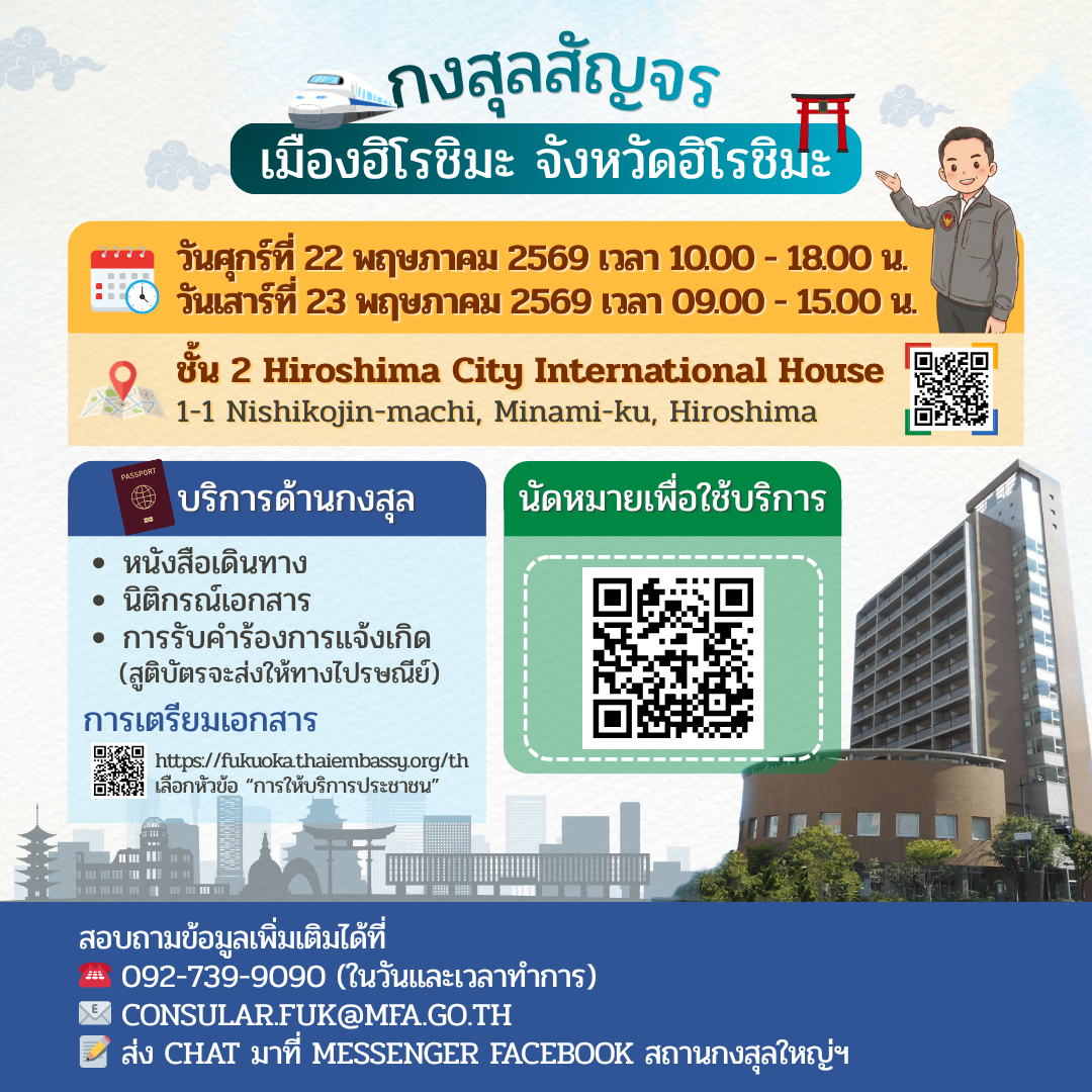สถานกงสุลใหญ่ ณ เมืองฟูกูโอกะ มีกำหนดจัดหน่วยเคลื่อนที่เพื่อให้บริการงานกงสุล (กงสุลสัญจร) ณ ชั้น 2 อาคาร Hiroshima City International House (広島市留学生会館) (Google Map: https://maps.app.goo.gl/gNHeNqv6N6dDYUGG8 ที่อยู่: 1-1 Nishikojin-machi, Minami-ku, Hiroshima, 732-0806) โดยมีรายละเอียด ดังนี้