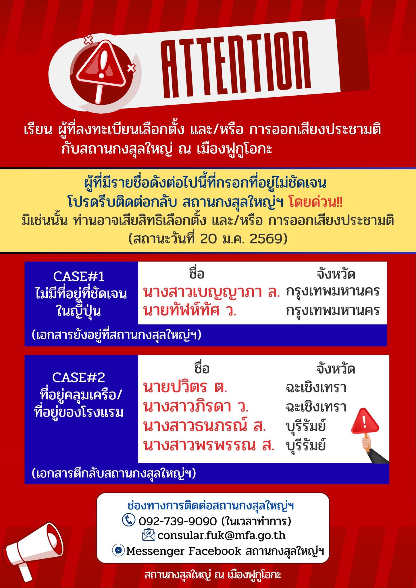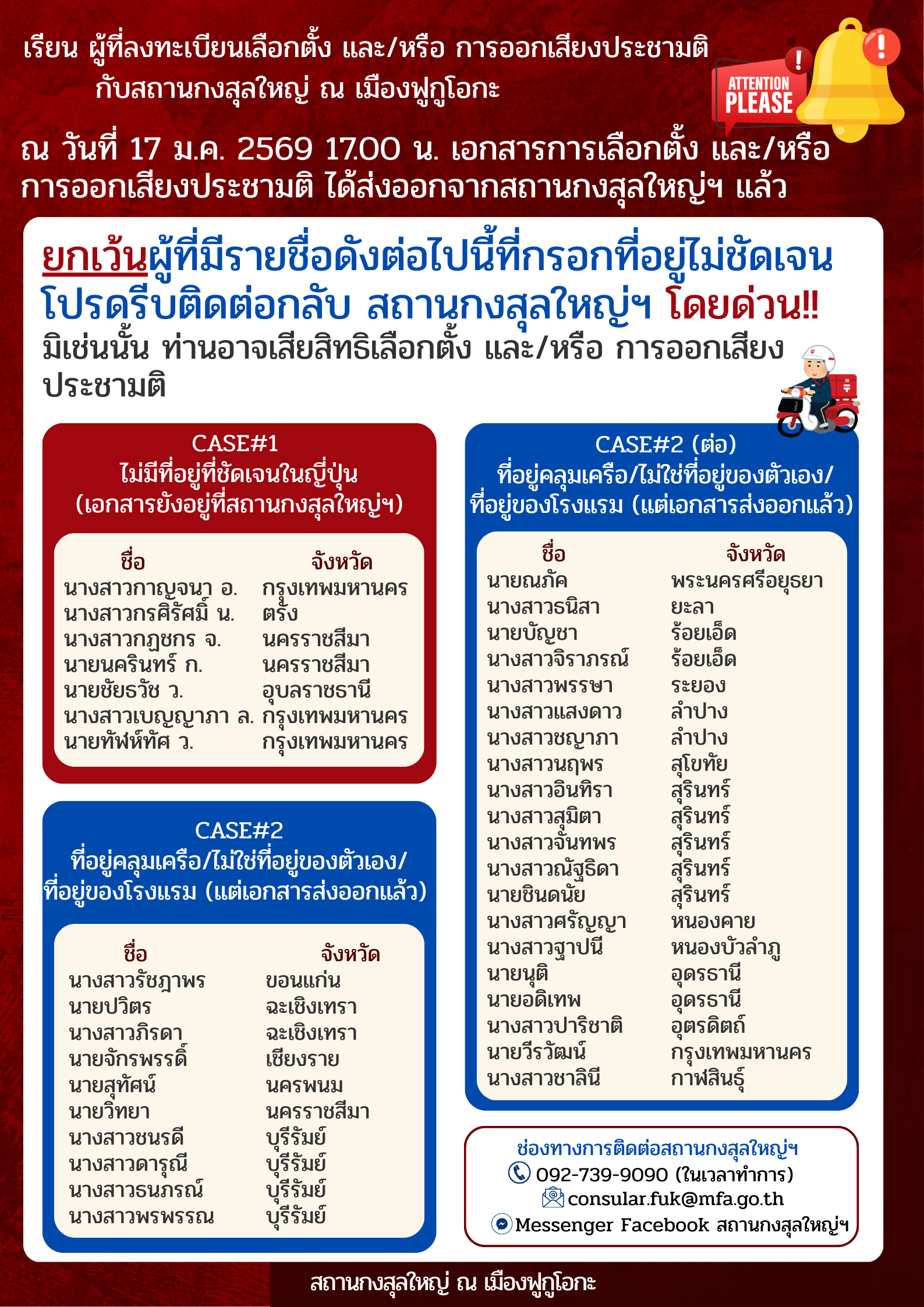 📢🗳️สถานกงสุลใหญ่ ณ เมืองฟูกูโอกะ ได้เริ่มจัดส่งเอกสารการเลือกตั้งและการออกเสียงประชามตินอกราชอาณาจักรให้แก่ผู้มีสิทธิฯ ทางไปรษณีย์แล้ว ตั้งแต่วันพฤหัสบดีที่ 15 มกราคม 2569 ที่ผ่านมา เมื่อท่านได้รับเอกสารแล้ว โปรดรีบดำเนินการทันที |